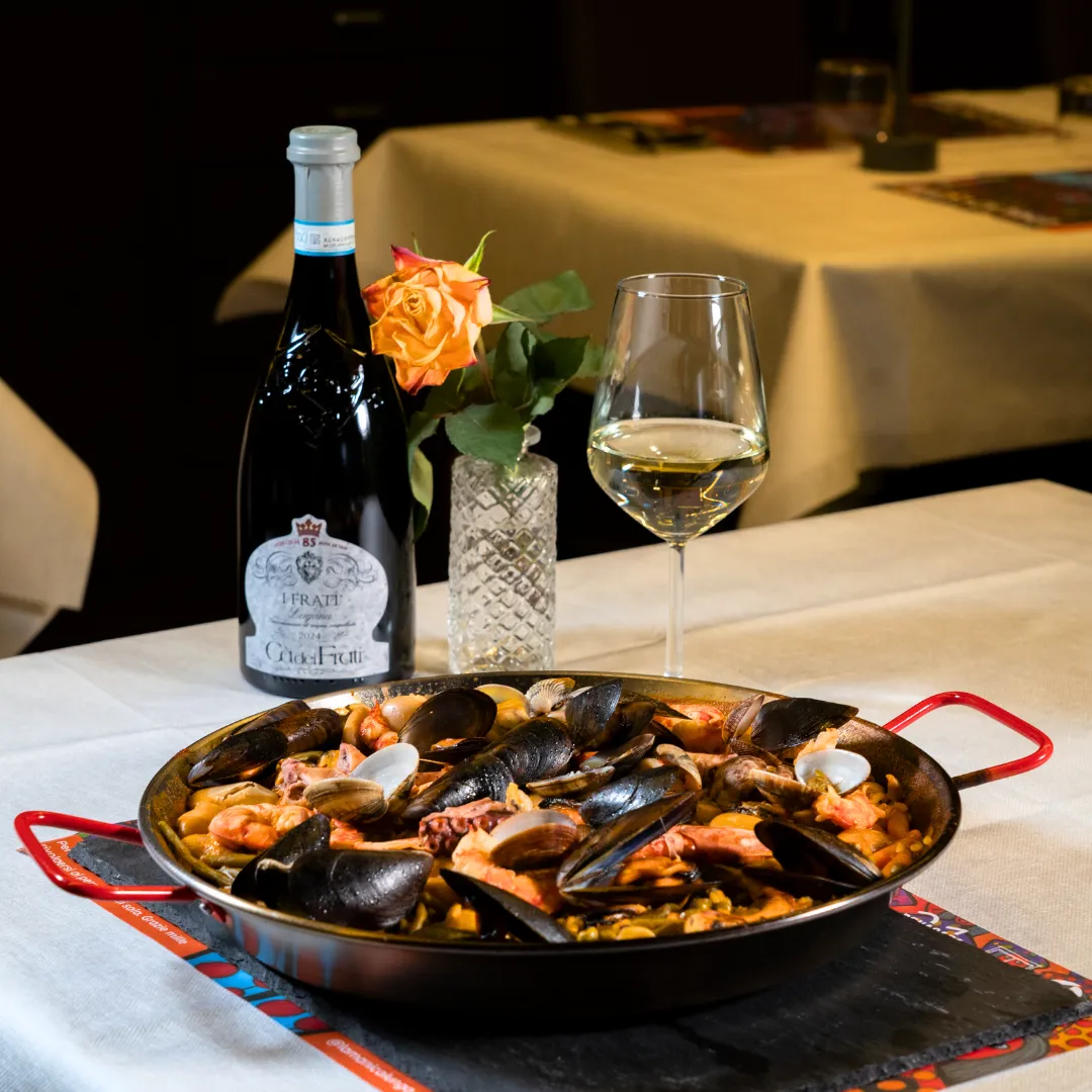 Ogni forchettata è un viaggio tra gamberi carnosi, calamari teneri e riso croccante ai bordi del tegame